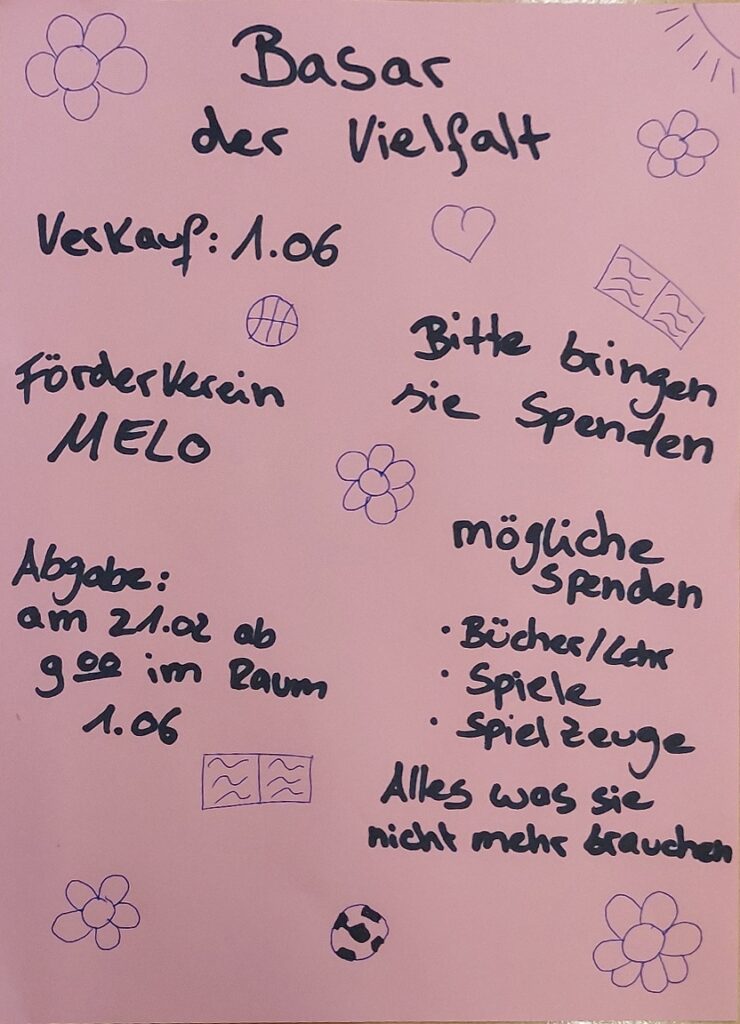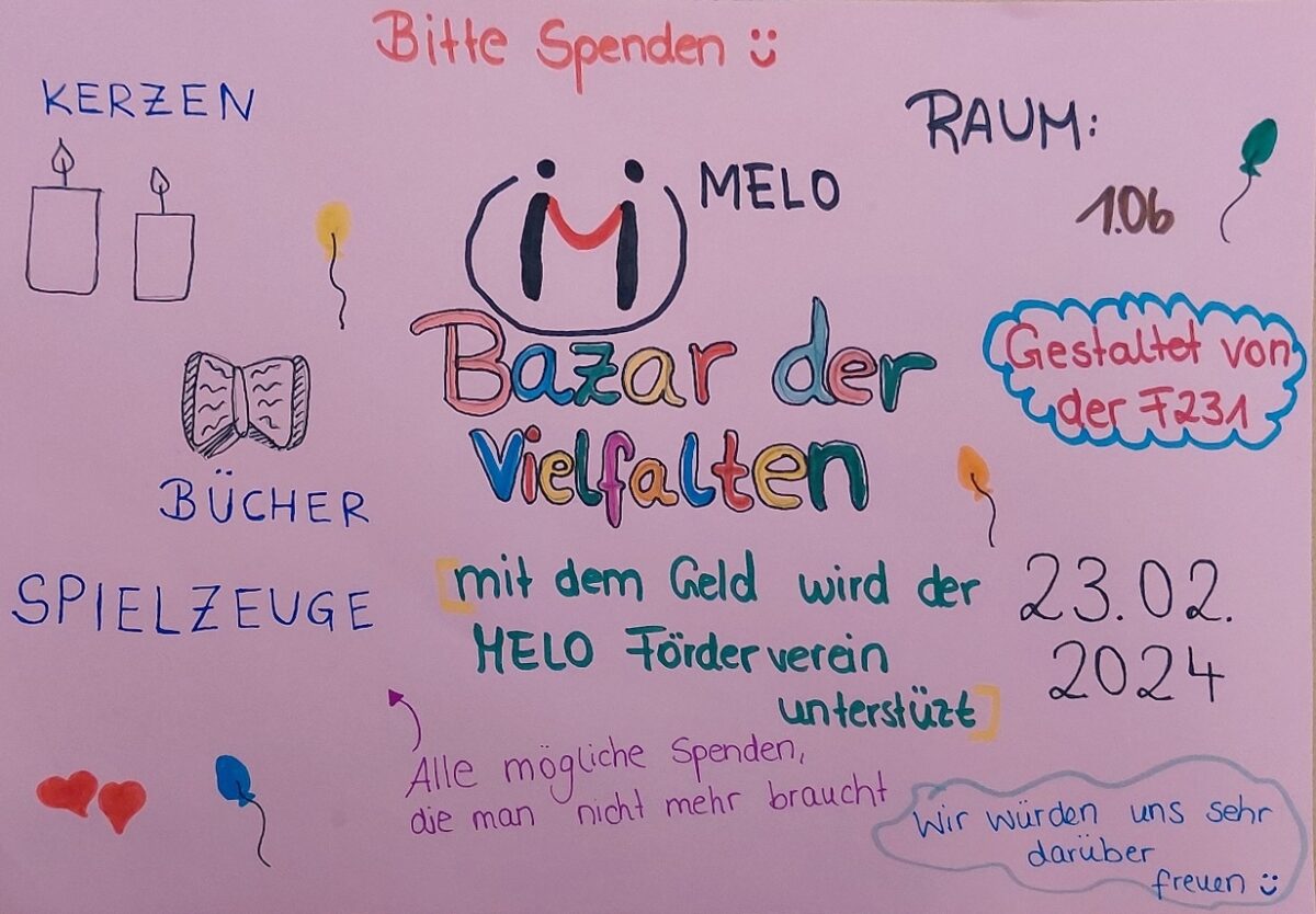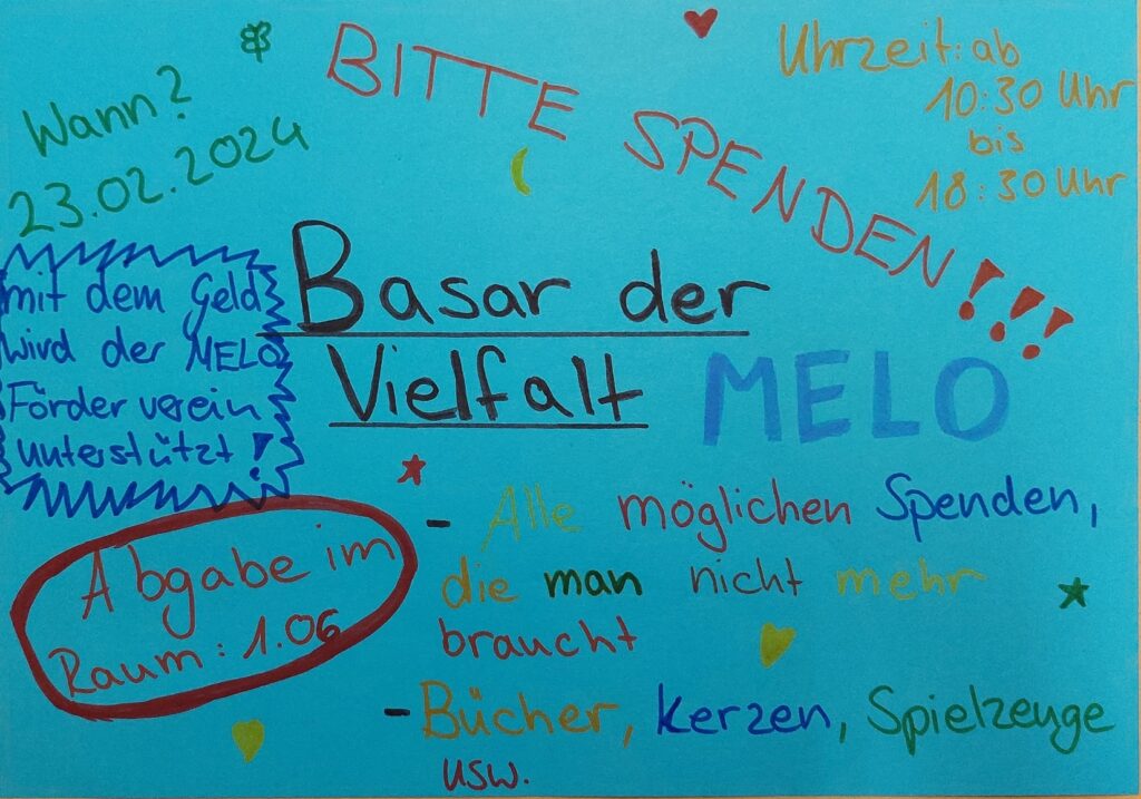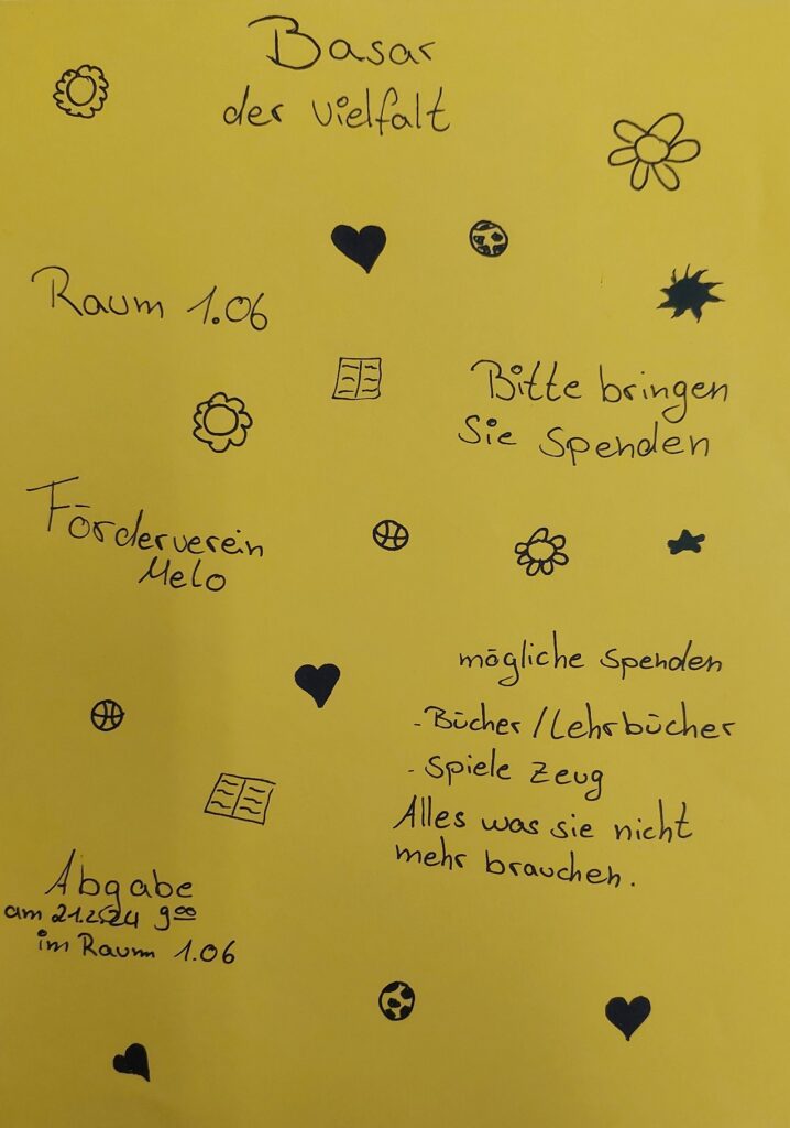 unter dem Titel „Basar der Vielfalten“ sammelt der Förderverein am 21.02.2024 ab 09:00 Uhr allerlei Spenden, die am Tag der der offenen Tür veräußert werden. Der Erlös kommt dem Förderverein zugute, der wiederum engagierte Lernende unterstützt.